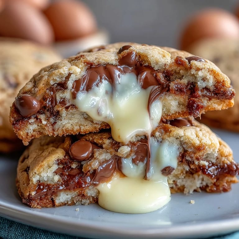 Save Indulge in a decadent twist on classic chocolate chip cookies with these Cadbury Egg Stuffed Chocolate Chip Cookies. Each cookie hides a gooey Cadbury Creme Egg center wrapped in chewy, buttery cookie dough, creating a delightful surprise in every bite. Perfect for Easter celebrations or whenever you're craving a rich, indulgent treat that combines nostalgic flavors and a fun, melty center.