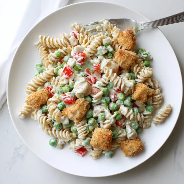 Save My aunt burst through the back door last summer with a bowl of this pasta salad, still sun-warmed from the car ride. We all hovered around the container on the counter, stealing forkfuls while she tried to explain how she made the chicken crispy. The crunch against the cool, creamy dressing was absolute magic.